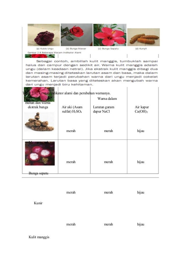 Jan 14 2013 Senyawa alam banyak yang digunakan sebagai indikator asam basa alami Beberapa tumbuhan yang bisa dijadikan sebagai bahan pembuatan indikator asam basa alami antara lain adalah kubis ungu sirih kunyit dan bunga yang mempunyai warna anggrek kamboja jepang bunga sepatu asoka bunga kertas Cara membuat indikator asam basa alami adalah